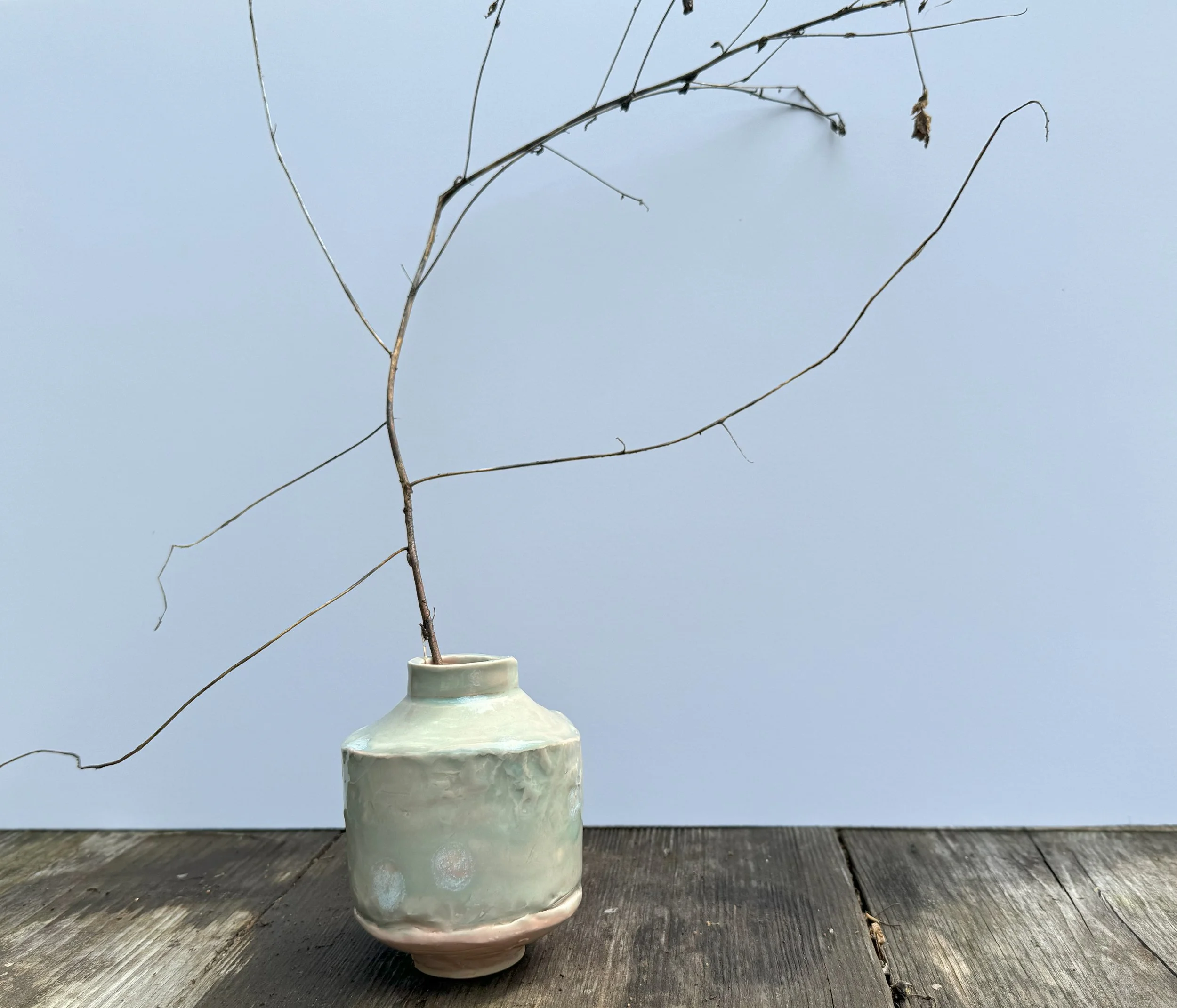 This handmade, slab-built vessel with a wabi-sabi aesthetic, shows the texture and imprint of human touch. It is a rebellion against perfection and machine made creations. The texture comes from spring plants in my garden, pressed into clay. This creates a realistic, but stylized call to nature. A pale blue glossy glaze with white splashes across a pink matte background. The vessel is approximately 4in in diameter, by 4.75in high, with a a 1.25in opening. This vessel is a second, as it has some slight cracks around the bottom seam, and will not hold water.